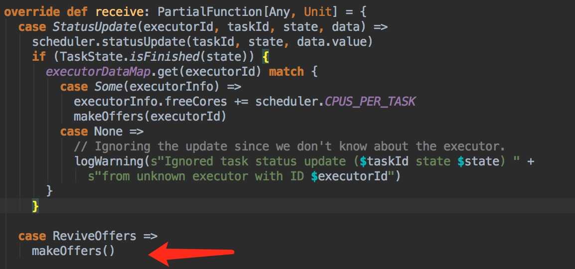 这里返回的RpcEndpointRef为NettyRpcEndpointRef类型,而RpcEndpointRef则是一个远程RpcEndpoint的引用,通过它可以给远程RpcEndpoint发送消息,可以是同步可以是异步,它映射一个地址。这么看来,我们在远端(ps:另外的机器或者进程)注册了一个RpcEndpoint,即DriverEndpoint,而在本地端(当前机器或者进程)则持有一个RpcEndpoint的引用,即NettyRpcEndpointRef,可以由它来往远端发送消息,那么发送的是什么消息呢?我们现在返回CoarseGrainedSchedulerBackend中的reviveOffers()方法,发现发送的是ReviveOffers消息。这里只是发送,具体处理还要看远端的RpcEndpoint,即DriverEndpoint。通过上面我们可以知道,RpcEndpoint的服务流程为onStart()–>receive()–> onStop(),每当消息来临时,DriverEndpoint都会调用receive()方法来处理。关键代码如下: